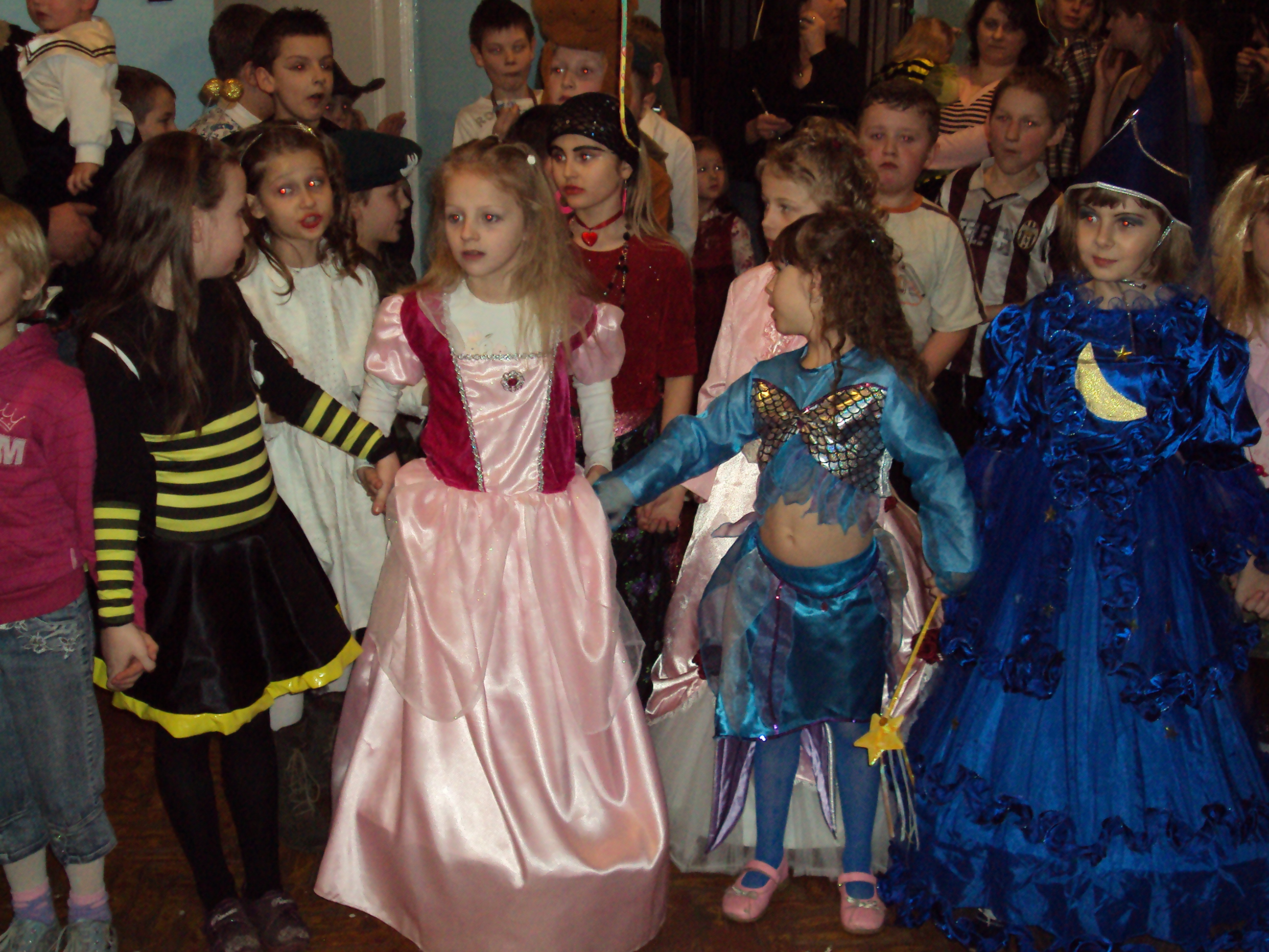 Podczas imprezy grom, zabawom i konkursom prowadzonym przez Pana wodzireja nie było końca. Każdy mógł się wykazać w wybranej dziedzinie. Największą jednak atrakcją, na jaką z zaciekawieniem wyczekiwały dzieci z klas I – III był bal przebierańców. Uczniowie razem ze swoimi rodzicami tańczyli przebrani za barwne postacie z krainy baśni i bajek. Rodzice byli dumni i szczęśliwi widząc swe pociechy w rolach królewien i królewiczów oraz innych baśniowych postaci. Widać było, że uczestnicy dobierając piękne stroje przygotowali się do zabawy bardzo starannie. Pan wodzirej zorganizował konkursy, w których należało wykazać się sprytem i fantazją. Uwieńczeniem wysiłków były ciekawe nagrody. Nie obyło się również bez poczęstunku, który pozwolił dzieciom zregenerować siły zużyte podczas wyczerpującej zabawy.