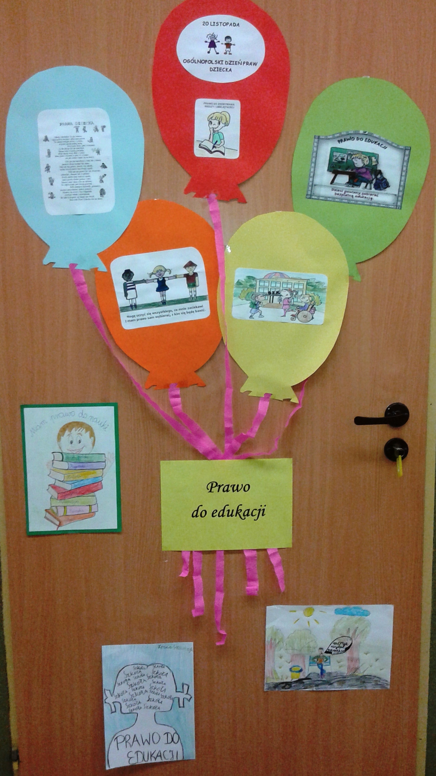 Następnie dzieci klas I-VI wykonali wspólną pracę plastyczną przedstawiającą wybrany paragraf Prawa Dziecka i umieścili na drzwiach prowadzących do swojej sali lekcyjnej.