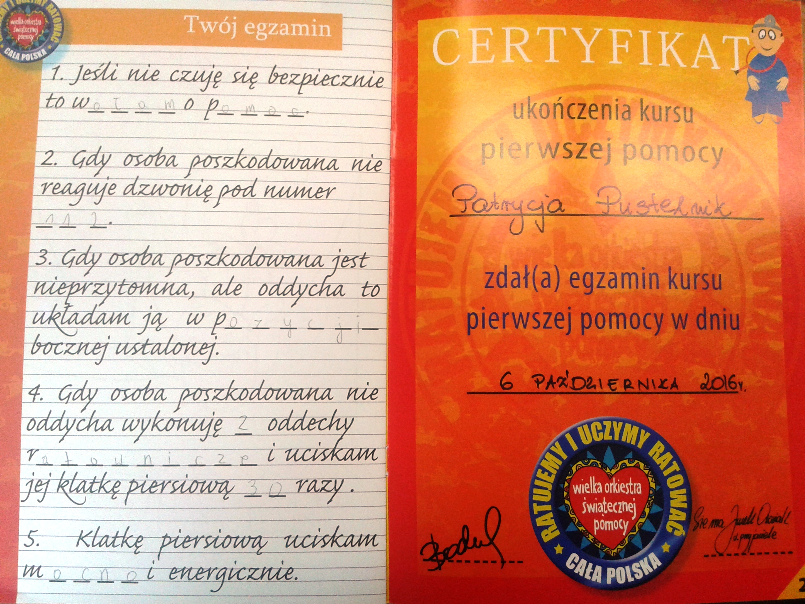 Każdy z nas – dorosły czy dziecko, może być świadkiem wypadku lub nagłego zachorowania. Wówczas ważna jest sprawność i umiejętność udzielenia pierwszej pomocy oraz czas – kluczowe są pierwsze 4 minuty, które grają decydującą rolę w możliwości przeżycia pacjenta po zatrzymaniu krążenia. Aby pomóc, trzeba wiedzieć jak to zrobić. Nauczyciele naszej szkoły odbyli takie szkolenia, a dodatkowo opiekunka SK PCK pani Aneta Garkut i opiekunka Samorządu Uczniowskiego pani Renata Boduch uczestniczyły w szkoleniu w ramach programu „Ratujemy i Uczymy Ratować” Fundacji WOŚP Jurka Owsiaka. Dzięki temu programowi pozyskaliśmy fantomy, a także dodatkowe materiały do nauki: ćwiczenia, podręczniki, dyplomy, telefony instruktażowe i mogliśmy (chyba profesjonalnie) kolejny raz przeszkolić uczniów klas I-VI z elementarnych zasad udzielania pierwszej pomocy. Na wstępie pan Andrzej Piwowarczyk przedstawił uczniom ogólne zagadnienia dotyczące udzielania pierwszej pomocy oraz podstawowe czynności ratujące życie. Następnie uczniowie przeszli do praktyki, trenowali na fantomach, a także na sobie nawzajem – układając pozorantów w pozycji bocznej ustalonej. Zajęcia pozwoliły nie tylko wyposażyć dzieci w wiedzę i umiejętności z zakresu rozpoznawania zagrożeń i zasad udzielania pierwszej pomocy. Przyczyniły się również do przezwyciężenia lęku i obaw przed podejmowaniem działań w sytuacji zagrożenia.